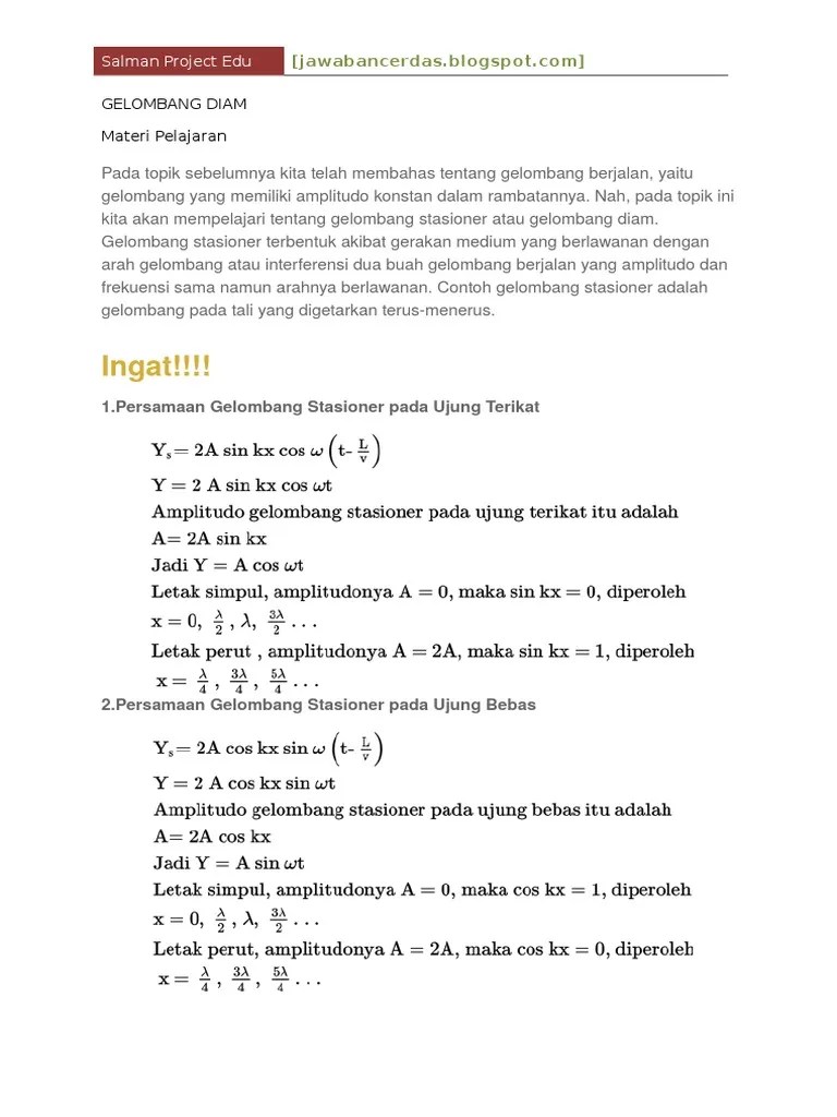 Pada saat t = 0. Di mana y dan x dalam meter sementara t dalam sekon. Memiliki persamaan frekuensi dan amplitudo b. Rangkuman makalah materi gelombang stasioner ujung bebas dan ujung terikat pembahasan mulai dari pengertian dan contoh soal serta pembahasannya. gelombang stasioner ujung bebas 2.