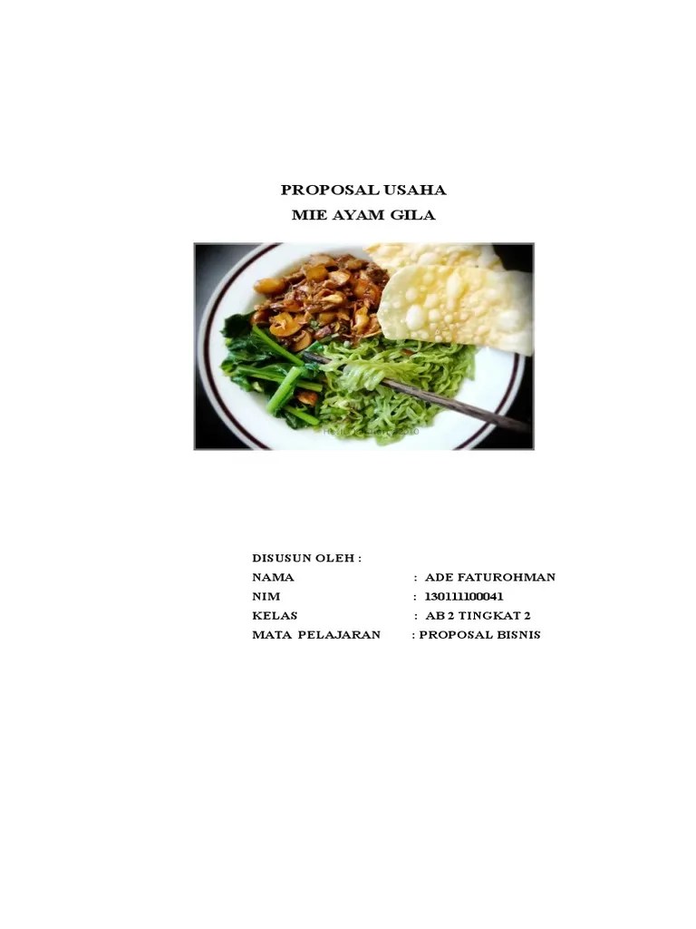 Makalah kewirausahaan âmie ayam goberâ created by : Kegemaran masyarakat mengkonsumsi mie semakin lama semakin meningkat. Proposal usaha mie pelangi senin, 19 mei 2014.silahkan langsung di download sini proposal bisnis mie ayam t ugas kelompok proposal bisnis mie . Usaha kuliner mie ayam jamur h. Gambaran usaha baksoâ dan mie ayam merupakan .